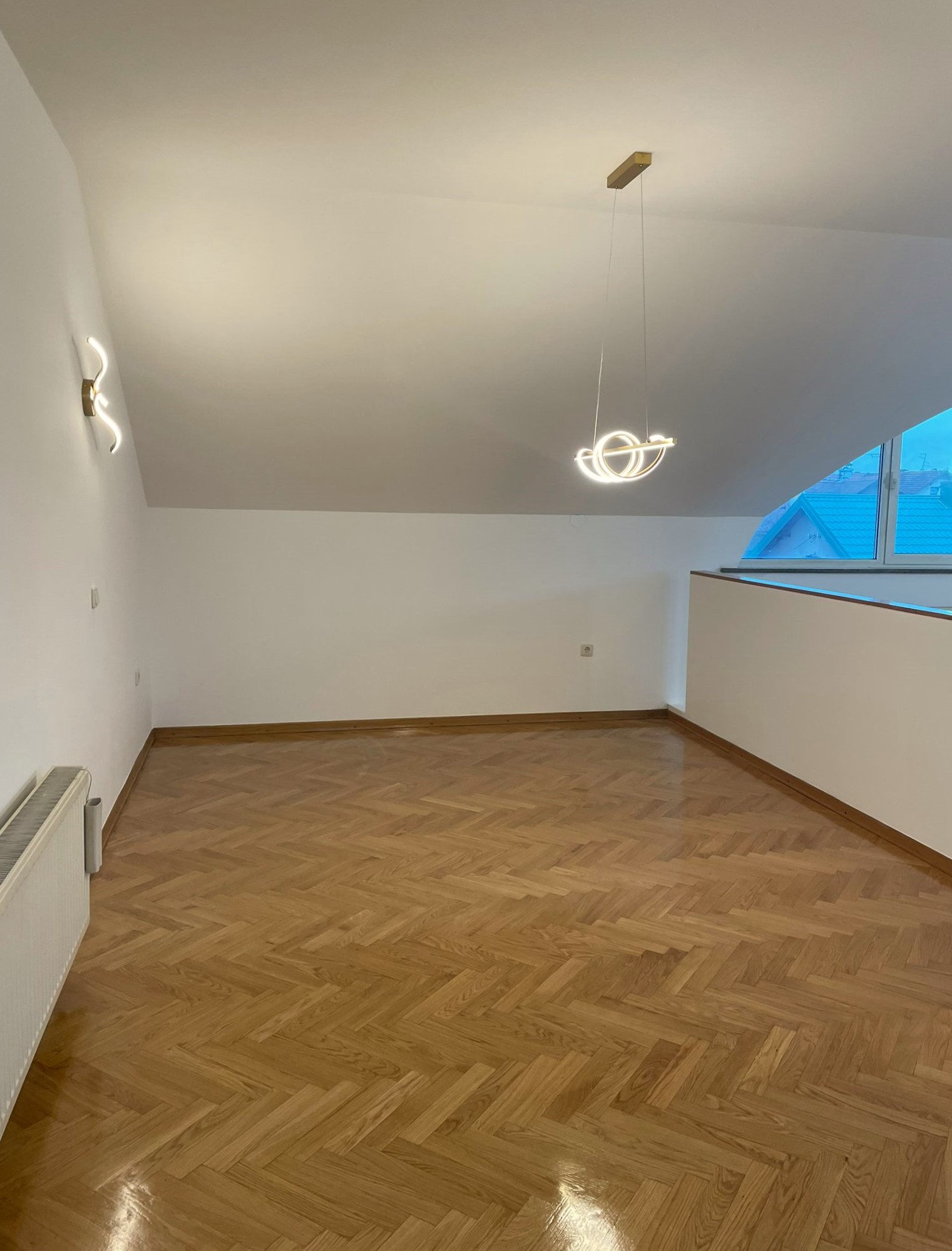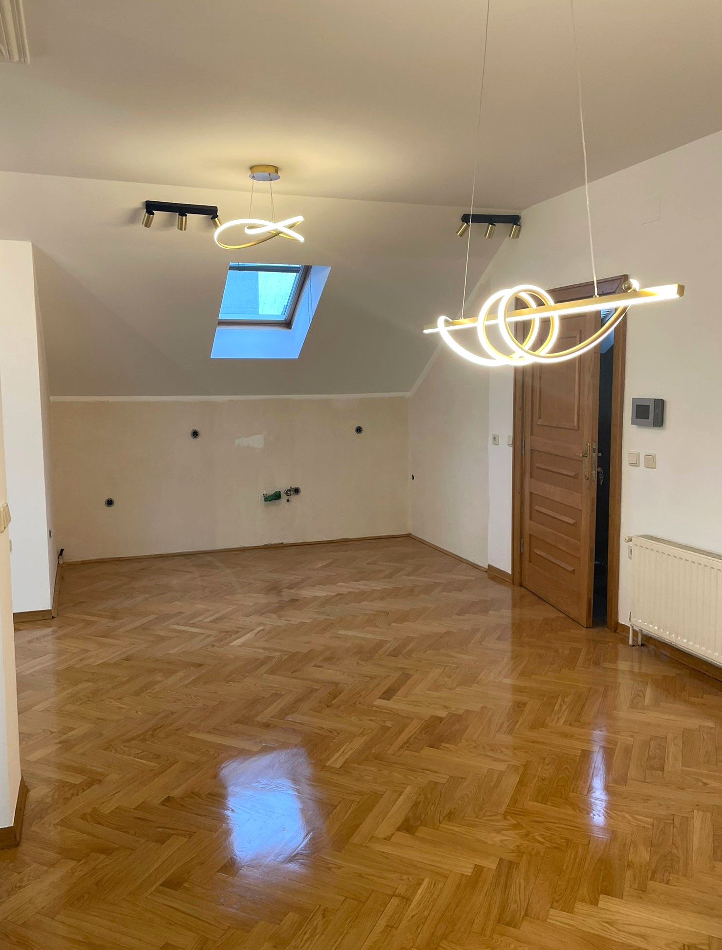 Prodaje se prostran trosobnan stan u novoj zgradi u blizini Avenije Dubrava. Nalazi se na drugom katu, ujedno i potkrovlju zgrade s klasičnim kosim krovom s crijepom. Sastoji se od open space kuhinje, blagovaonice i dnevnog boravka s izlazom na terasu. Spavaći dio je odvojen manjim hodnikom u kojemu se nalaze dvije spavaće sobe s krovnim prozorima, kupaonica s kadom i odvojen toalet. Stropovi su visoki i djelomično pod kosinama, što u kombinaciji s velikim prozorima daje puno svjetla i osjećaj prostranosti. Parketi su hrastovi, novo obrušeni i lakirani. Nutarnja stolarija je kvalitetna drvena, a vanjska je višeslojna aluminijska rađena po mjeri. Zanimljiv je njihov oblik, koji maksimalno iskorištava svjetlost dajući osjećaj ateljea i suvremenog prostora.